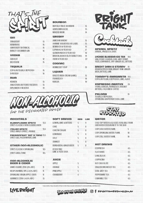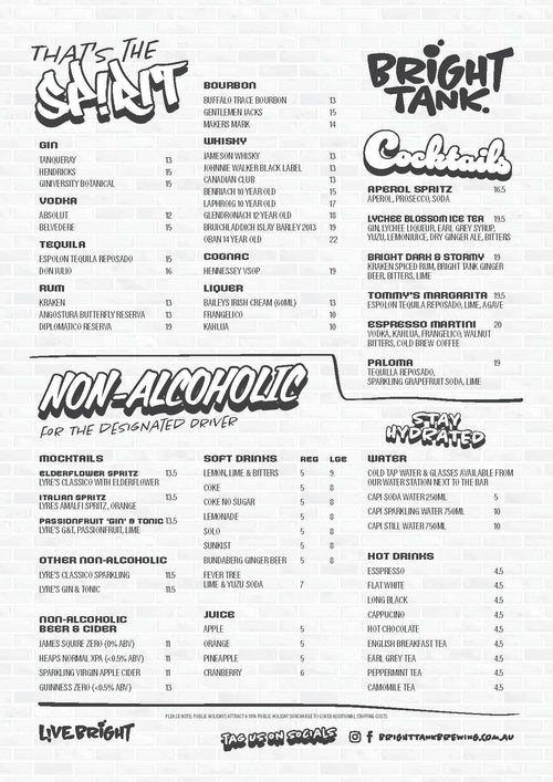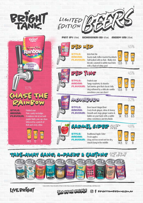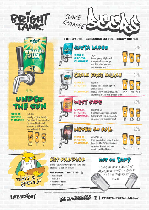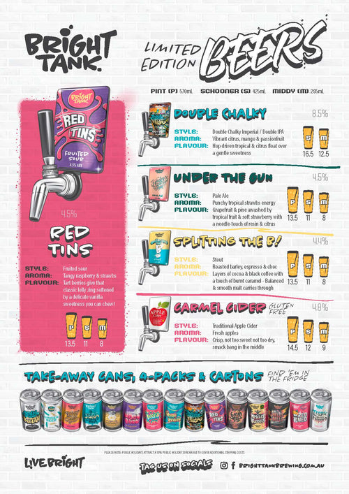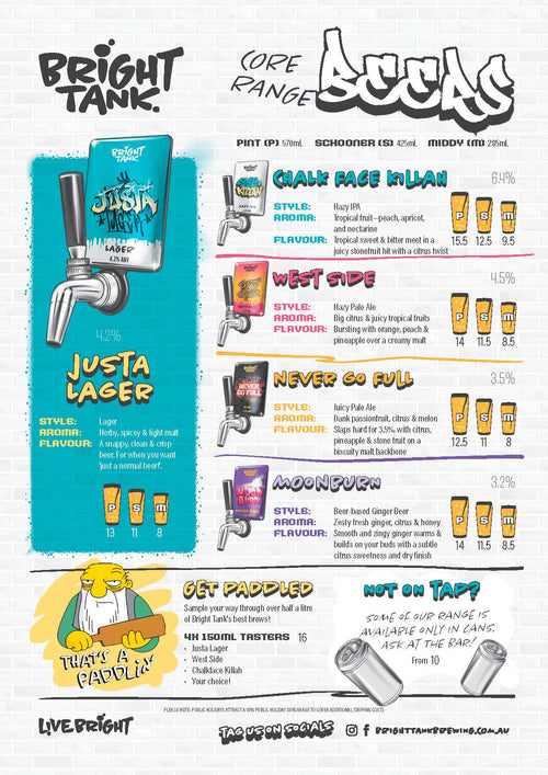 Us humans are a smart bunch. We’ve been refining the beer making process for over 5,000 years. Bright Tank is where that art meets science. Our team’s processes have been developed with mover 30 years’ combined experience, combining age-old traditions and the latest tech. We’re out the back pulling the levers and chasing the taste. And good taste never goes out of fashion.